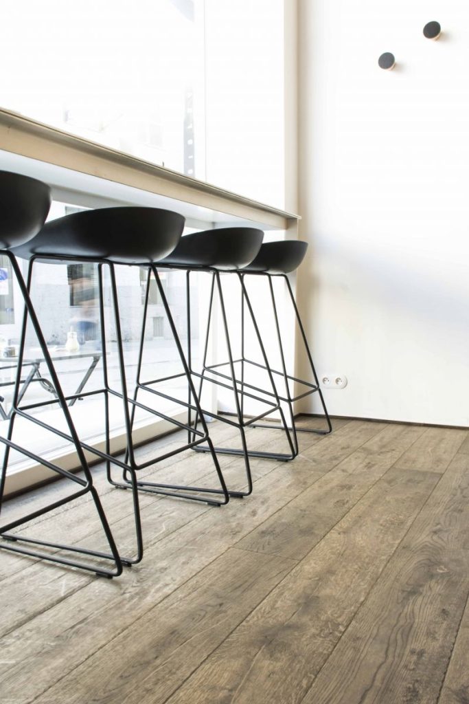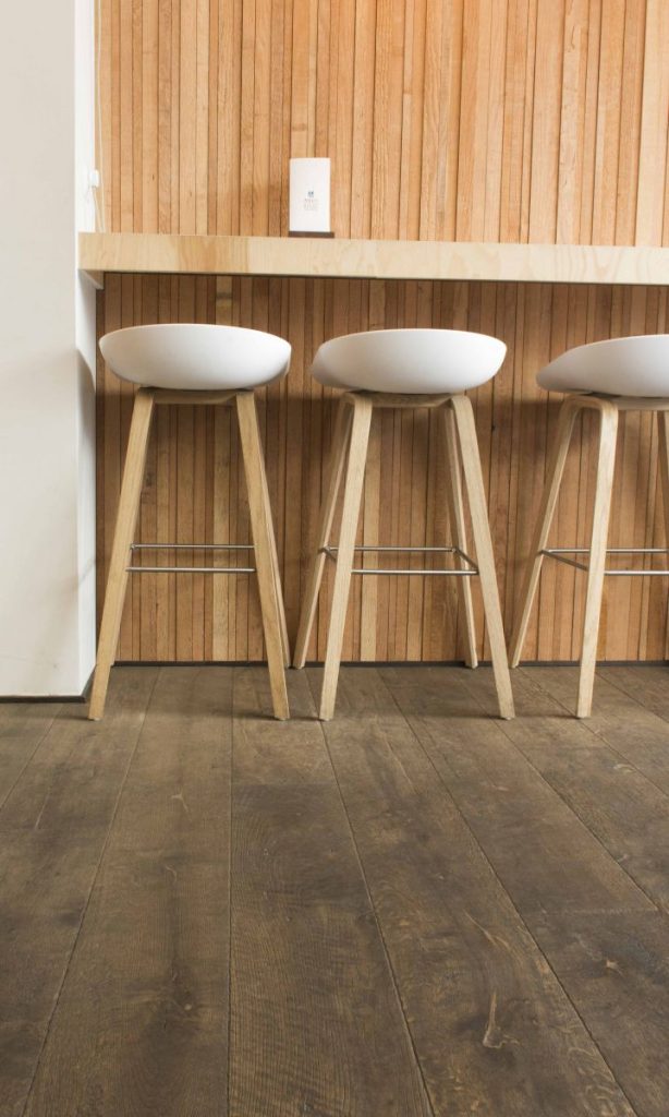 Oiled oak parquet flooring with knots, cracks, and bevels, manually aged.